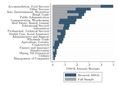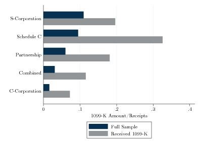 How does third-party income reporting affect tax compliance? We use confidential administrative data from tax returns and information reports to estimate the impact of third-party income reporting on small business tax compliance. Since 2011, payment settlement entities (e.g., American Express) were required to report payment card transactions to both the firm and the Internal Revenue Service using Form 1099-K. This requirement made businesses’ receipts from payment cards—but not their cash receipts—third party reported. Consequently, businesses located in higher payment card use areas experienced greater levels of third-party reporting than businesses located in lower credit card use areas. We construct an index of payment card use at the commuting zone level, and we use this variation to identify the effect of Form 1099-K on reported receipts and deductions by small businesses. Overall, we find that the legislation modestly increased reported receipts without significantly increasing deductions. We also find substantial heterogeneity, with smaller firms, firms in business-to-consumer industries, and partnerships reporting a relatively large increase in receipts and a partially offsetting increase in deductions, implying a modest increase in tax compliance.
